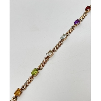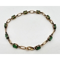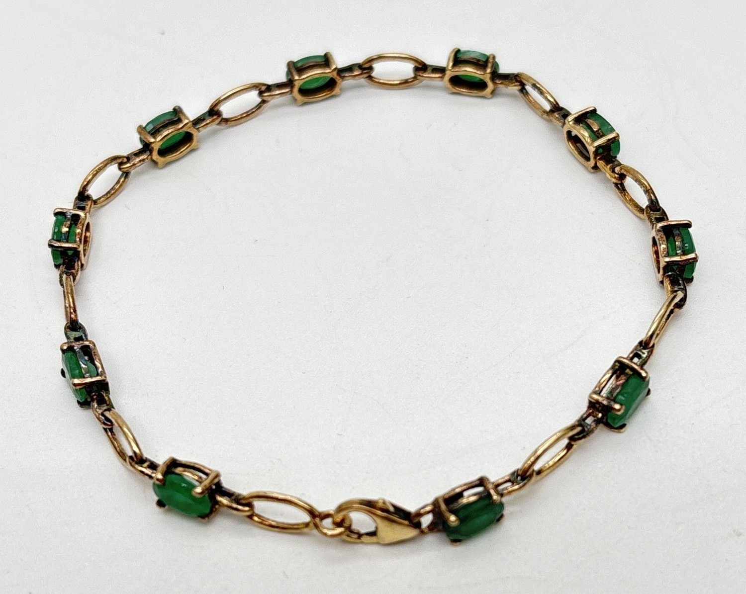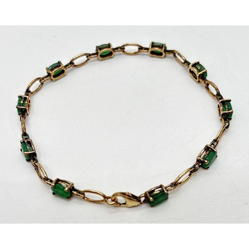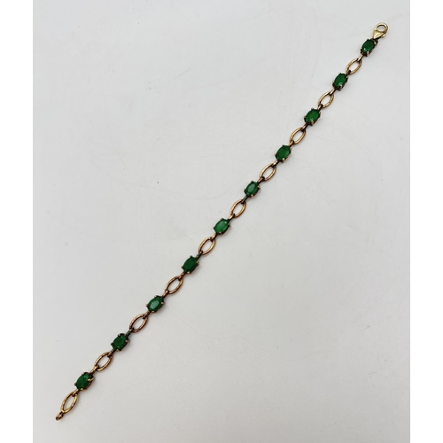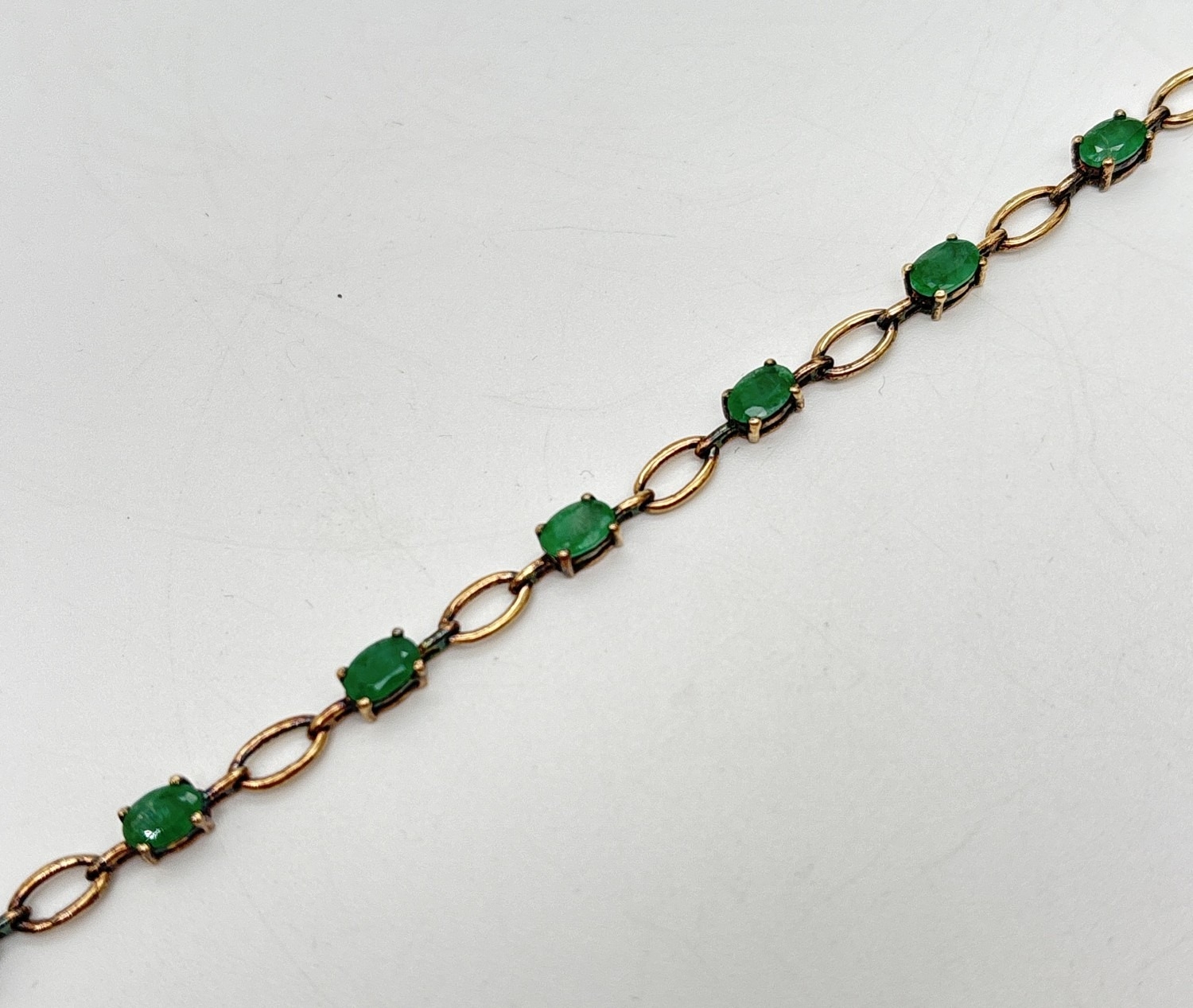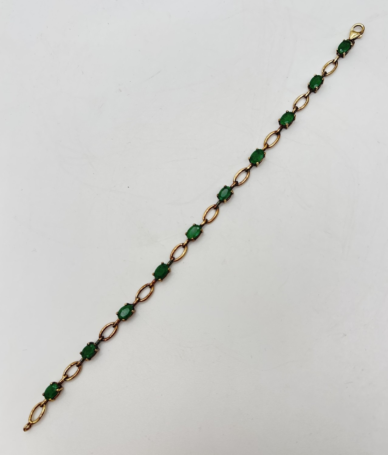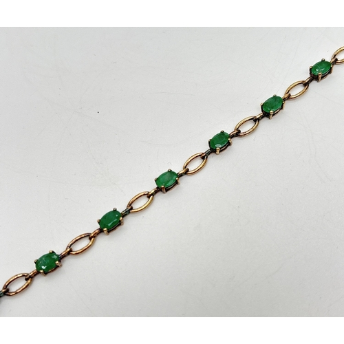 A silver and emerald 7.5" bracelet of alternating oval cut emeralds and open design links. With lobster claw clasp. Stamped 925.
