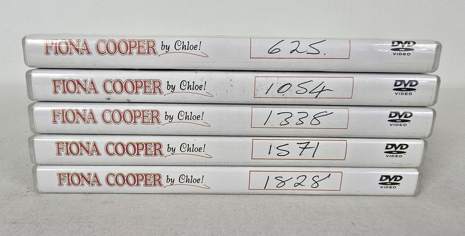 5 assorted Fiona Cooper adult erotic DVD's in hard plastic cases. With hand written catalogue numbers.