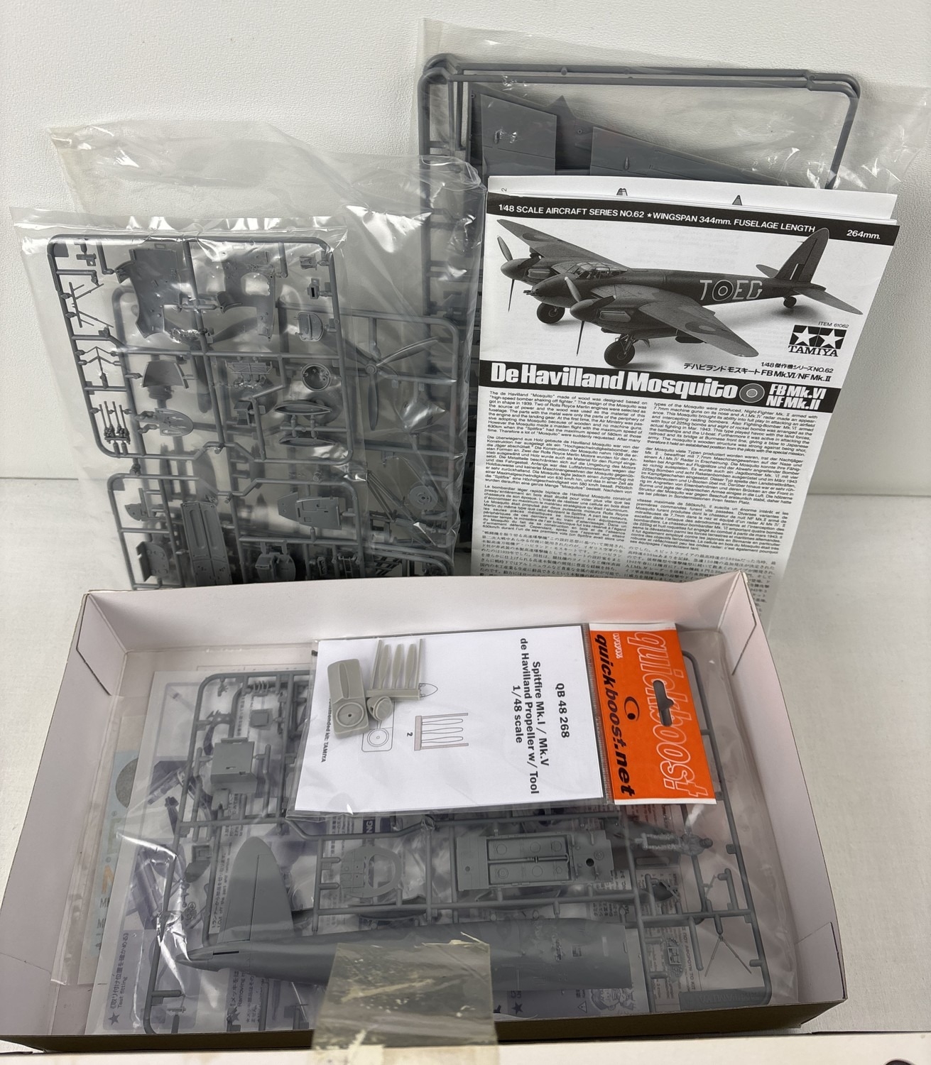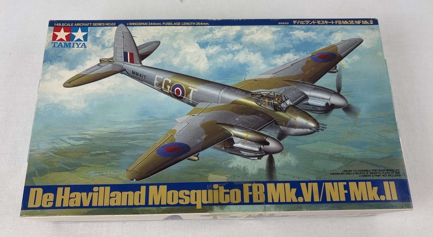 A Tamiya 1:48 scale construction kit - DeHaviland Mosquito Mk.VI/NF Mk. II. Kit components sealed and complete, with instructions.