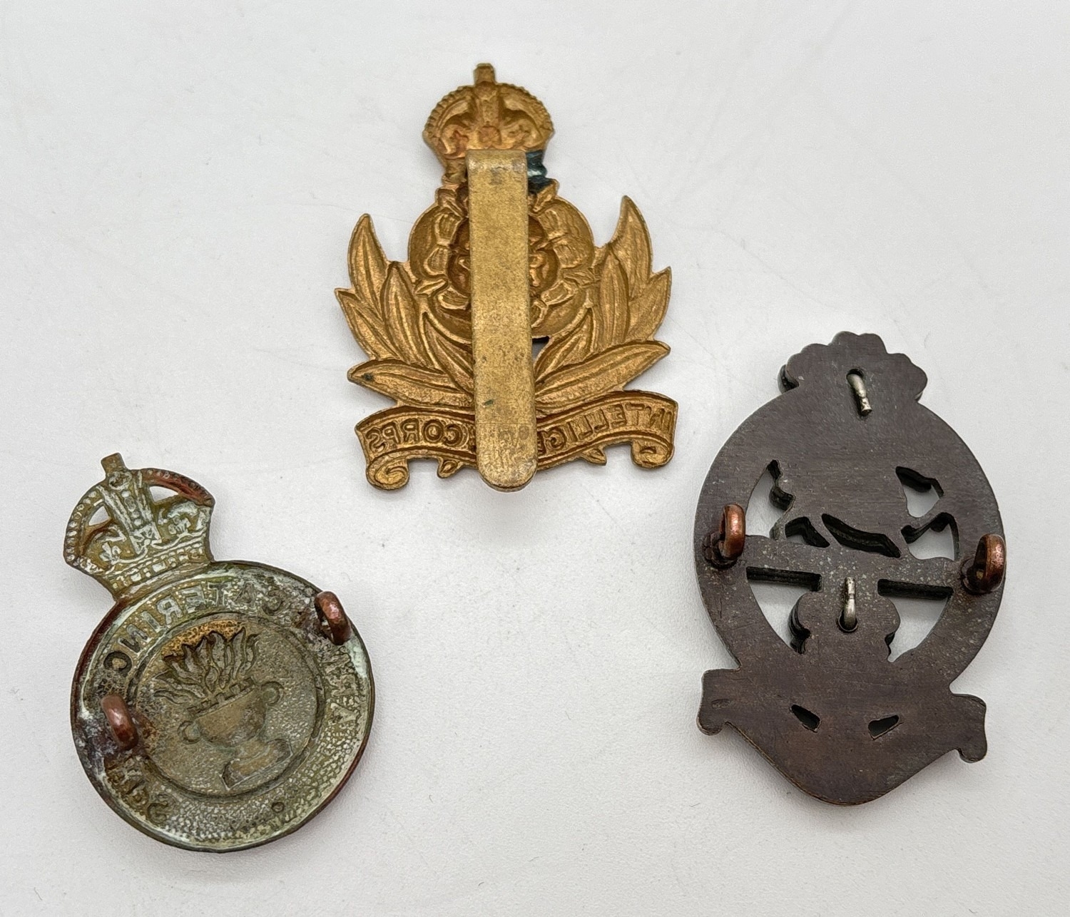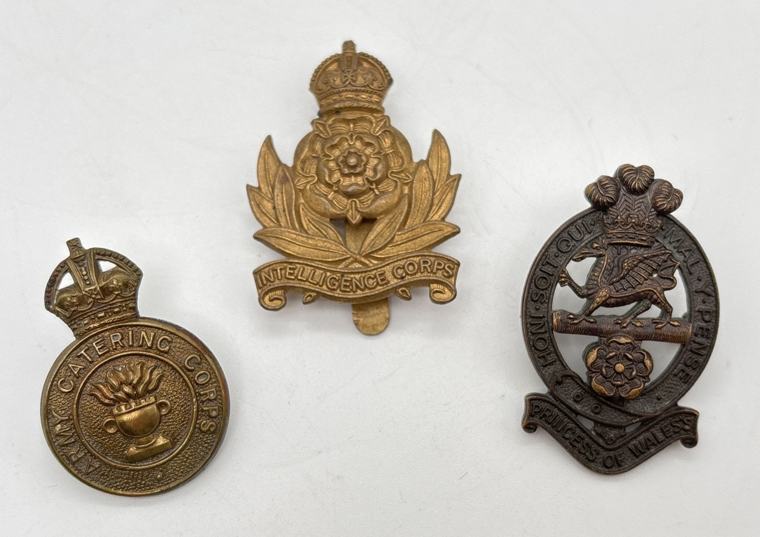 3 vintage army regiment cap badges. Princess of Wales Royal Regiment with fixing lugs to back but no pin; Intelligence Corp with brass slider to back; and Army Catering Corp with rear lugs but no pin. Largest approx. 4.5 x 3.5cm.