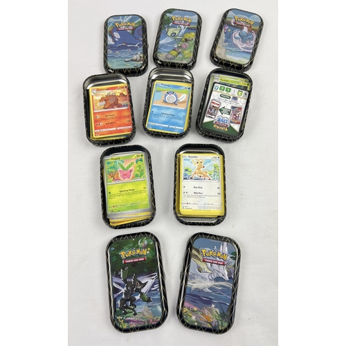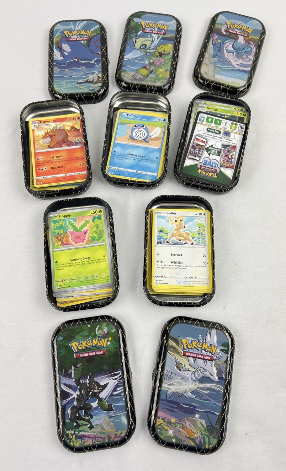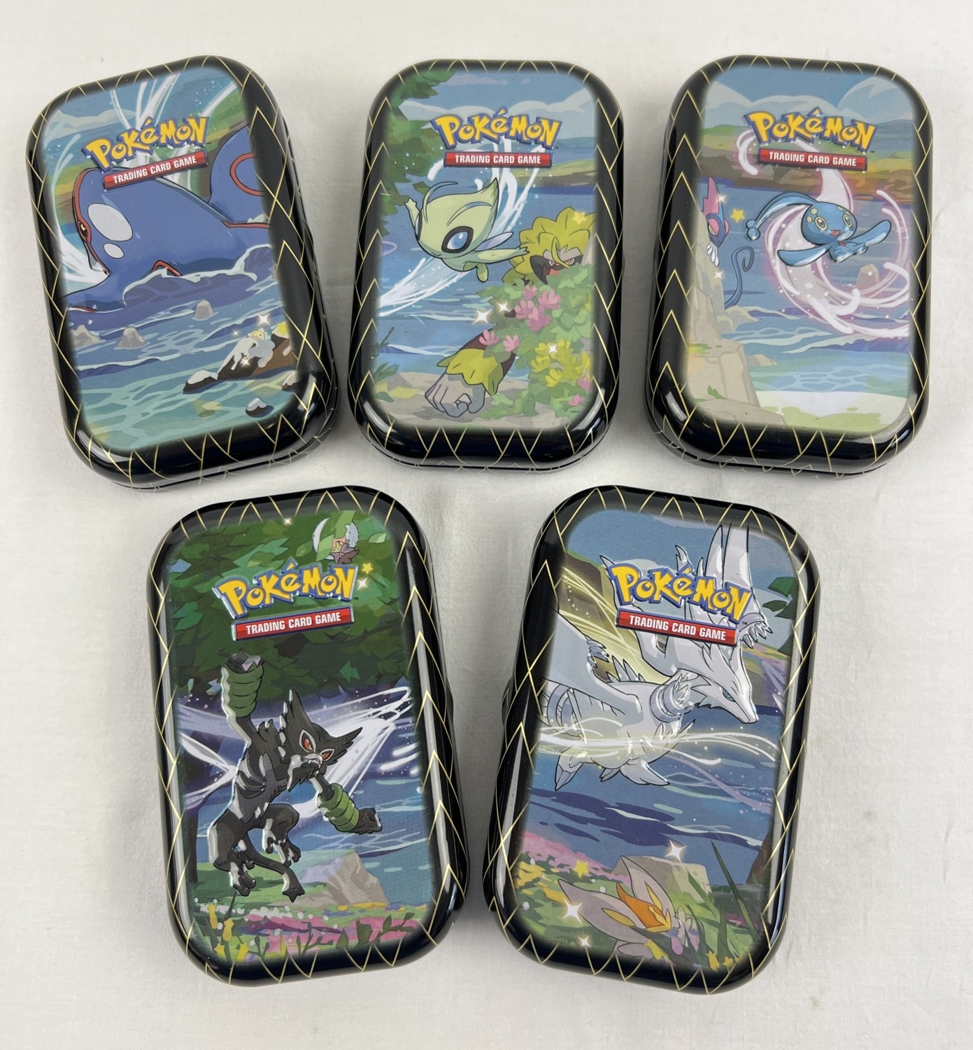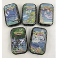 5 Pokemon TCG Shining Fates mini tins, each containing 30 pokemon cards, a online redeem code card and card sleeves.