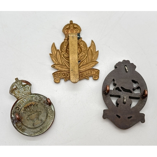 3 vintage army regiment cap badges. Princess of Wales Royal Regiment with fixing lugs to back but no pin; Intelligence Corp with brass slider to back; and Army Catering Corp with rear lugs but no pin. Largest approx. 4.5 x 3.5cm.