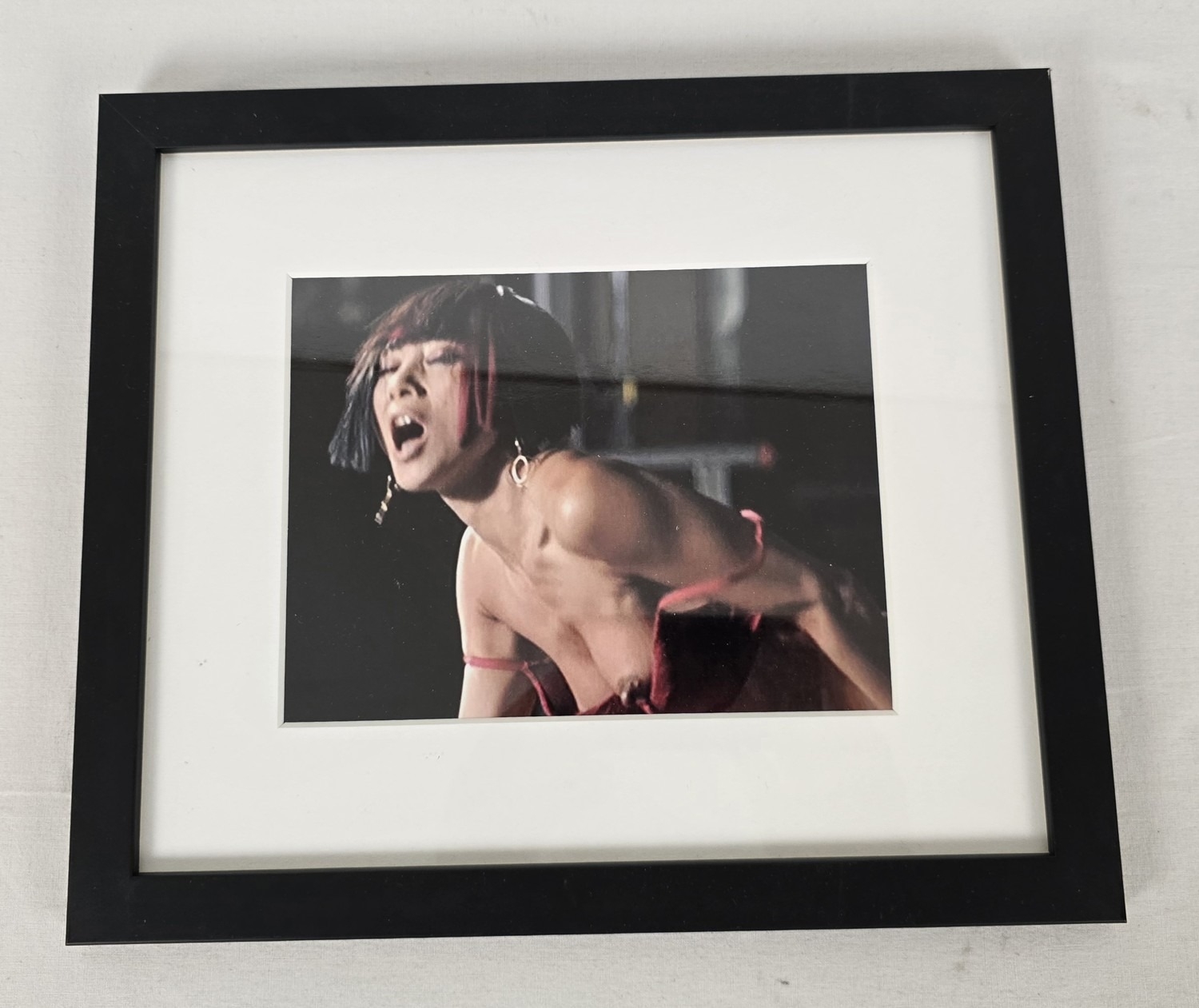 A framed & glazed semi nude photo of Chinese American Actress Bai Ling. Frame size approx. 28 x 32.5cm.