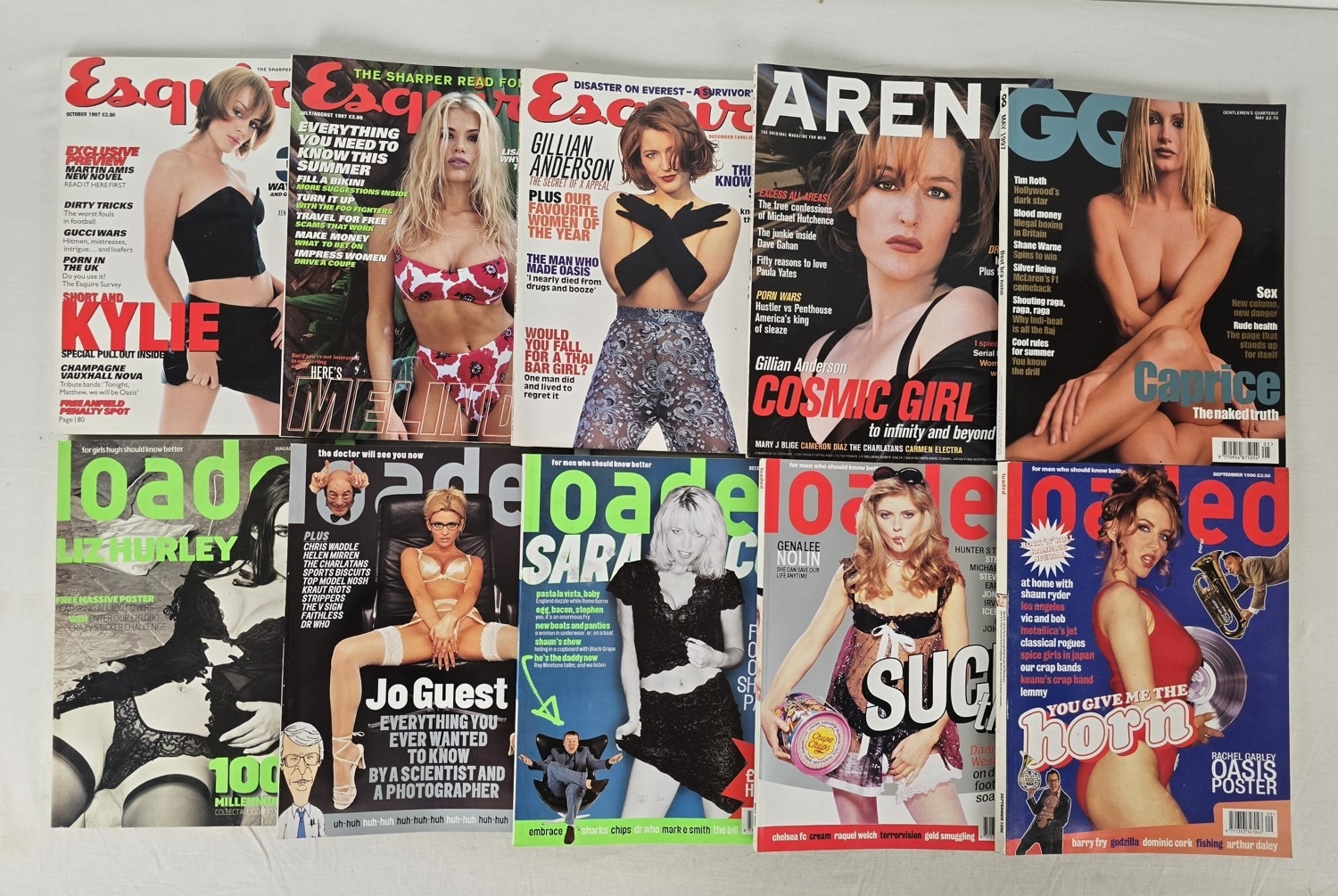 10 assorted 'Lads Mags' dating from the 1990's, to include Loaded, Esquire, GQ and Arena. Includes front covers featuring Liz Hurley, Gillian Anderson, Sara Cox, Caprice and Kylie Minogue.