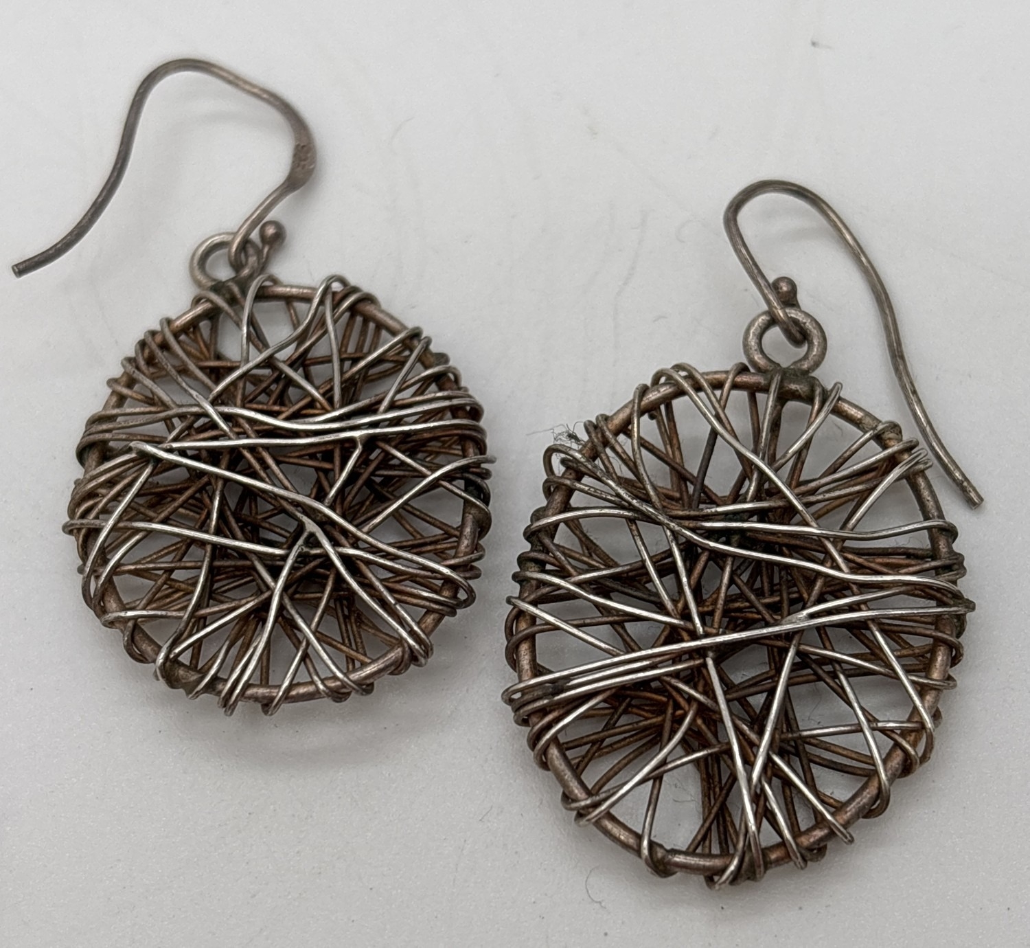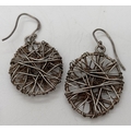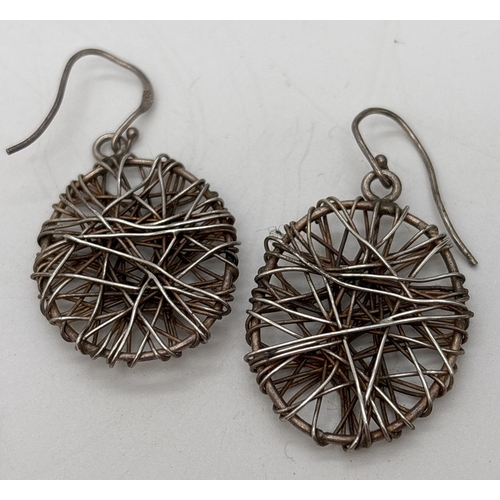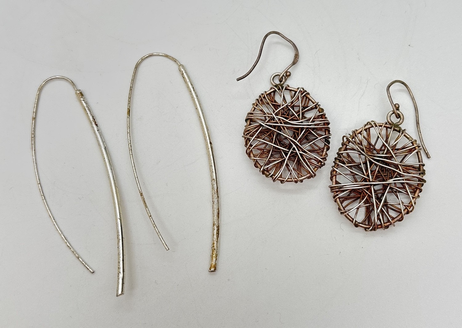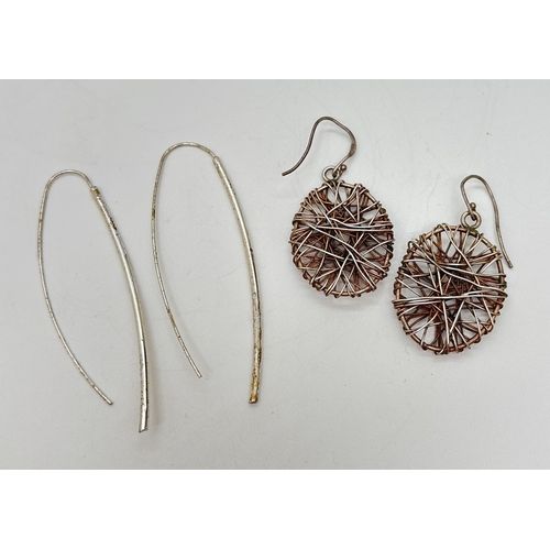 2 pairs of silver modern design large earrings. A pair of oval drops with multiple criss cross wires, together with a pair of slim drop earrings with large hooked posts. Both stamped 925. Largest pair approx. 7.25cm long.