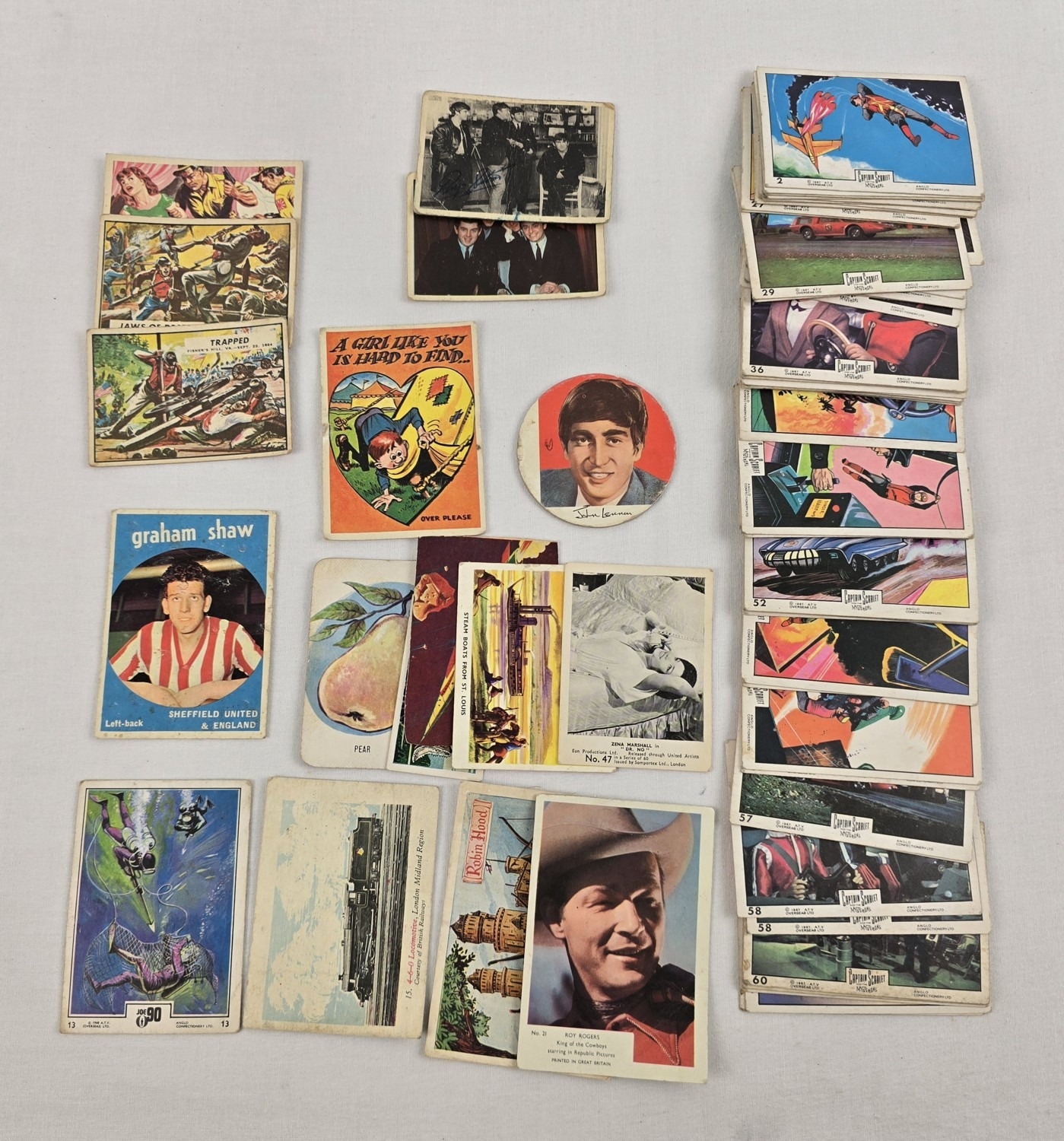 70 assorted 1960's collectors cards to include 53 assorted Captain Scarlett & The Mysterons Anglo Confectionery cards from 1967. Lot also includes odd A&BC Bubblegum cards, Weetabix, Cardmaster and John Lennon The Beatles coaster.