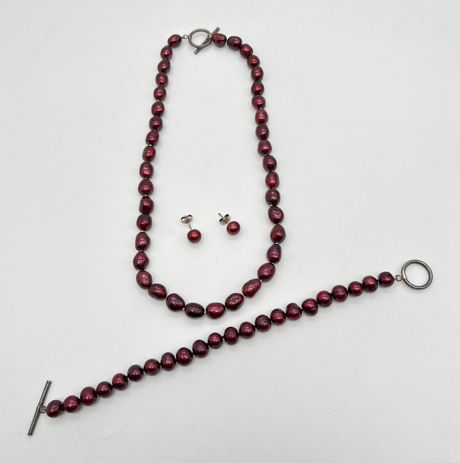 A burgundy freshwater pearl necklace with matching bracelet and stud earrings. 16 inch necklace and 7.5 inch bracelet with T bar clasps, each have 925 stamped on fixings.
