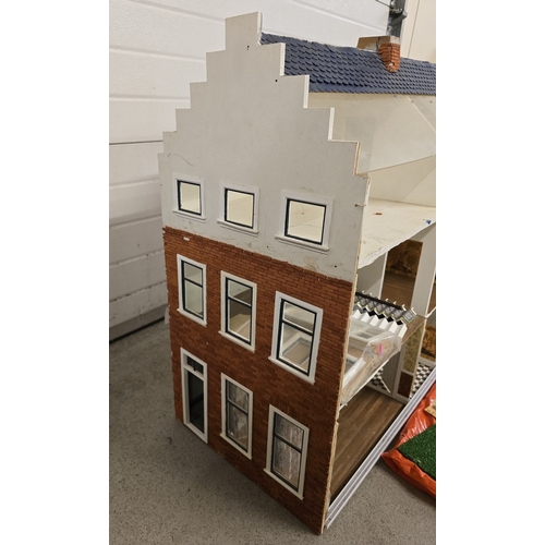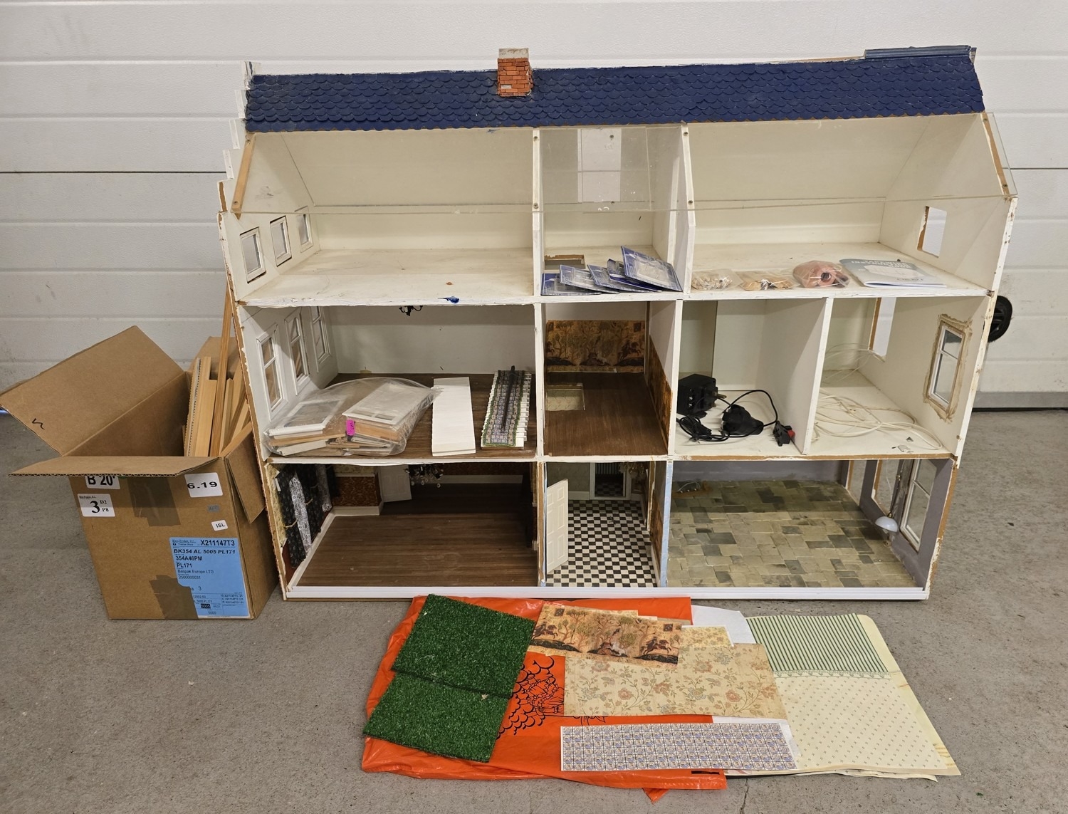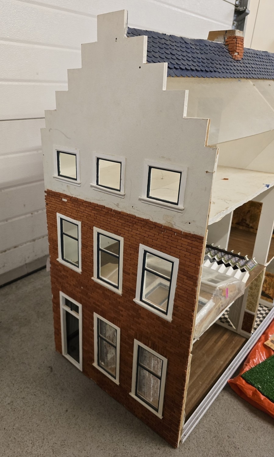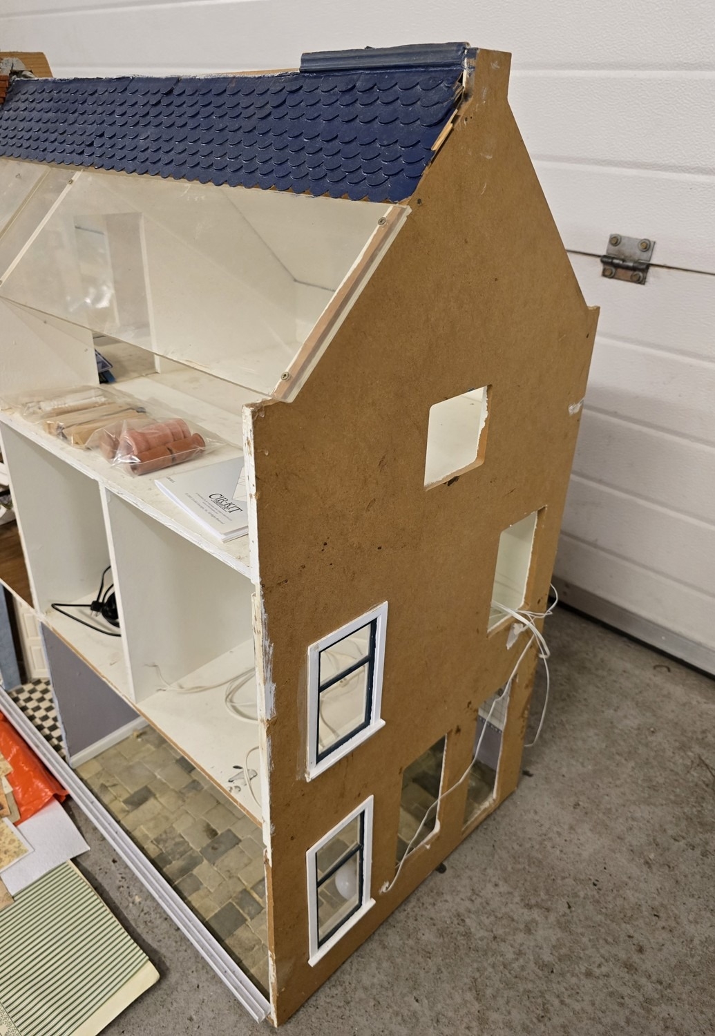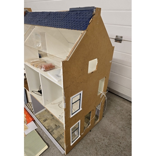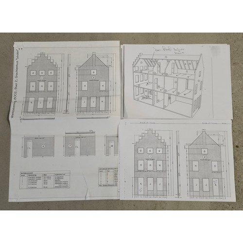 A work in progress Dutch Canal House, Dolls house. It’s wired for electric lights, some of which are fitted but not tested. Parts for build ” Drawing and plans, including roof tiles, chimney’s and light fittings staircase's, wallpaper and wood to complete the build. fitted with perspectives panels rather than doors to cover the “opening” side. size approx. 86cm x 111cm x 42cm.