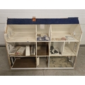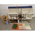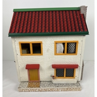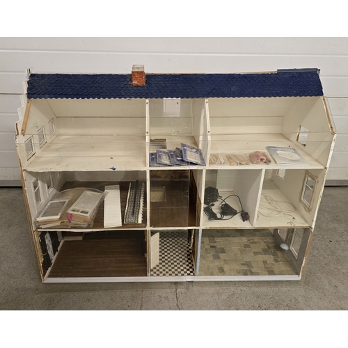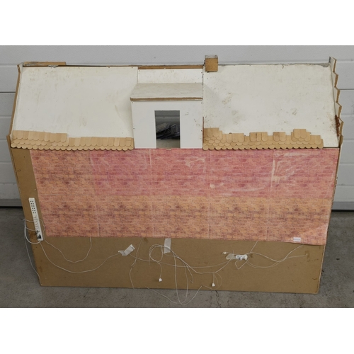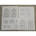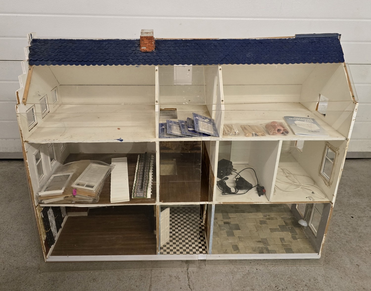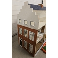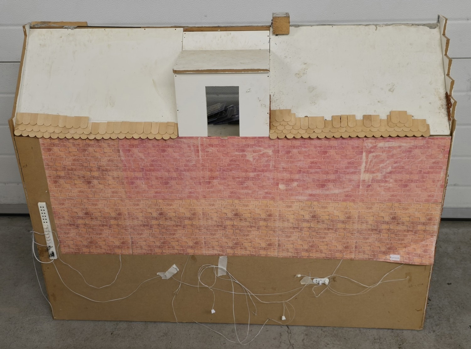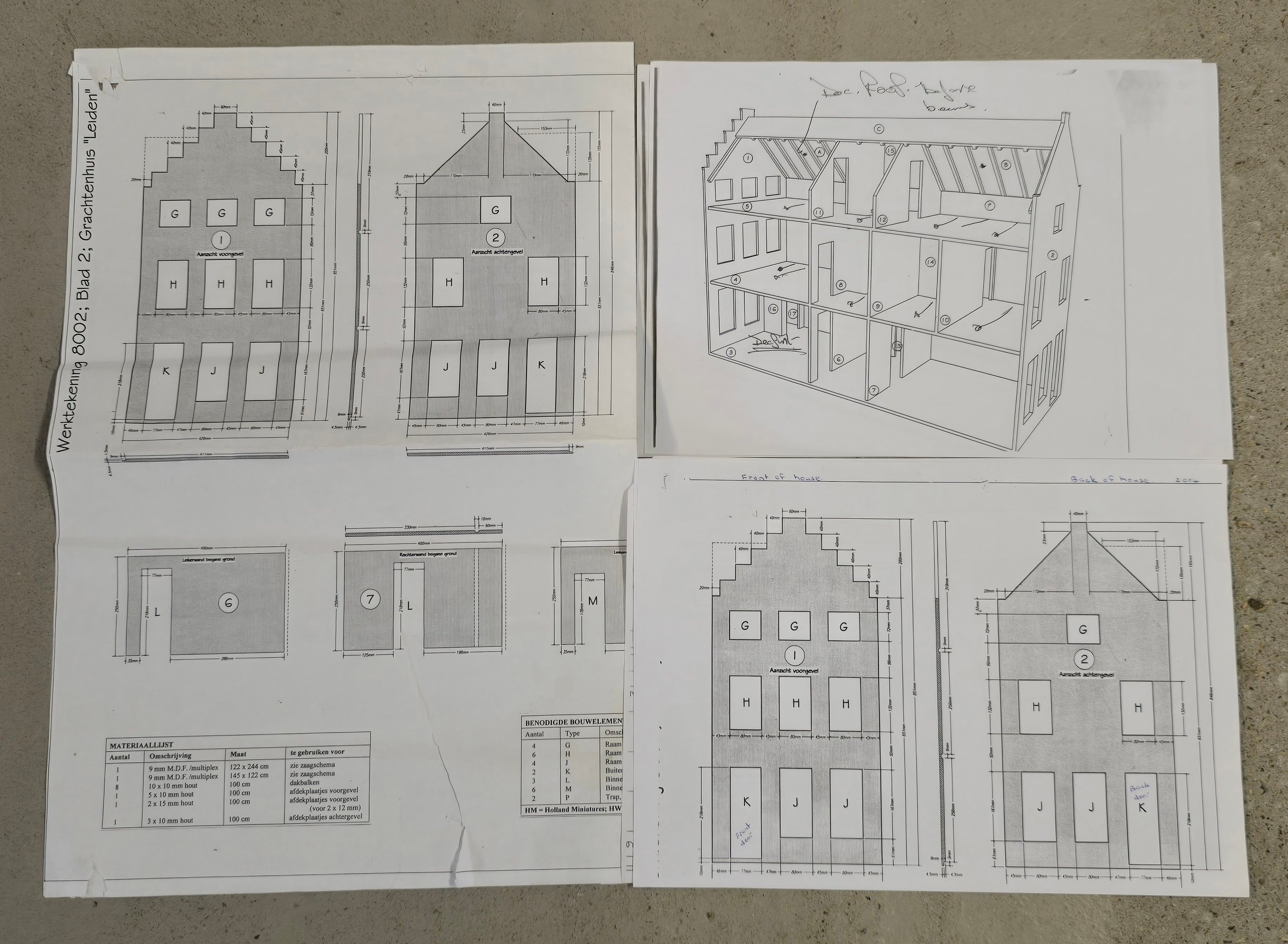 A work in progress Dutch Canal House, Dolls house. It’s wired for electric lights, some of which are fitted but not tested. Parts for build ” Drawing and plans, including roof tiles, chimney’s and light fittings staircase's, wallpaper and wood to complete the build. fitted with perspectives panels rather than doors to cover the “opening” side. size approx. 86cm x 111cm x 42cm.