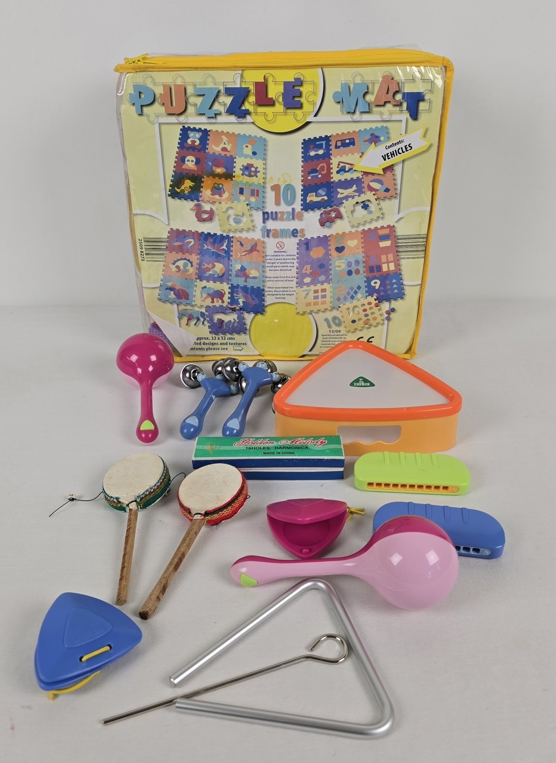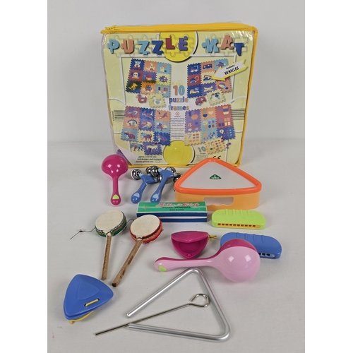 A collection of assorted children's musical instruments together with a large foam puzzle mat. Instruments include a boxed harmonica, monkey drums, maracas and tambourine.